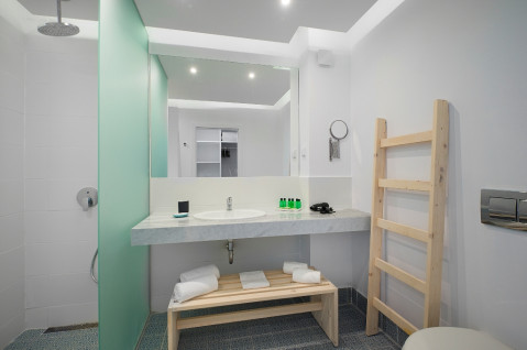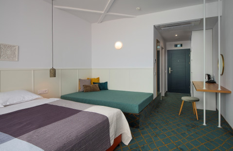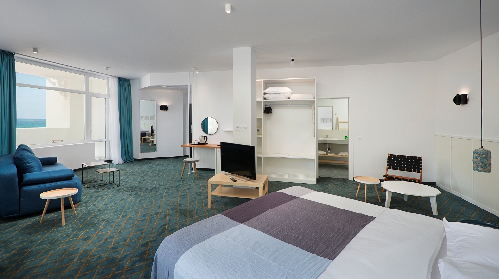 SUITE: 2две зоны (гостиная и спальная зона), 1 обычная кровать (1 двуспальная кровать) и один раскладной диван (подходит для 2 детей или одного взрослого), ванная комната с душем, дополнительный туалет; 2в.+2р., 3в.; 50м2;