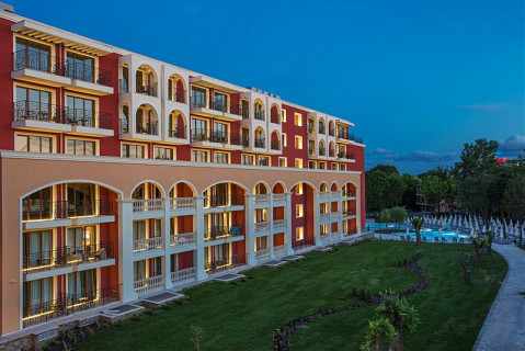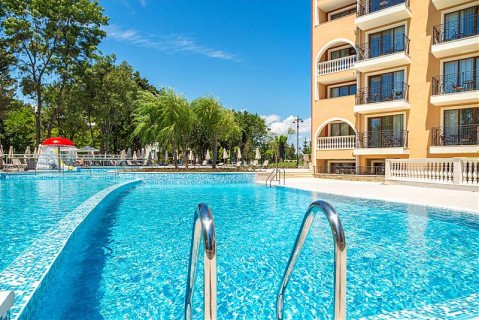 В 50м. от пляжа. 269 номера. Двухместные номера (22-25кв.м.) с балконом, студио (35кв.м.) с балконом, апартамент (45кв.м.) с дверью между комнатами, с или без балкона. Последний ремонт - 2018/новое 6-этажное здание/.