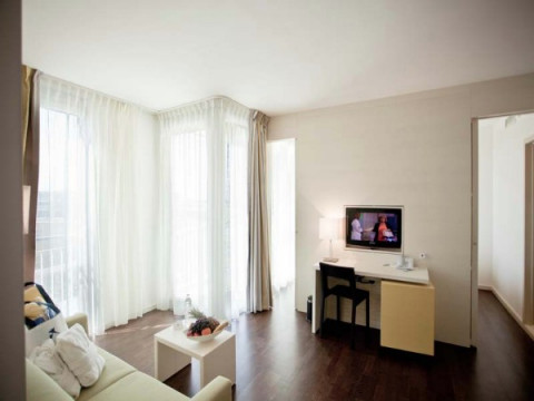 FAMILY SUITE (43 кв.м, балкон, спальня с соединенными кроватями twin, отделенная раздвижной дверью гостиная с диваном, зона детской спальни, 2 ванные комнаты (одна с душем и ванной, вторая с ванной), раскладной диван-кровать (1,40 х 1,45 м) в гостиной, макс. 2 взр. + 4 реб.)