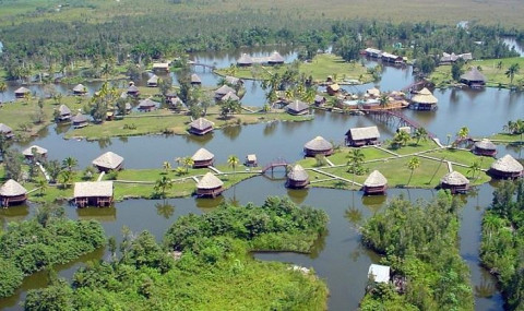 Через некоторое время Вы оказываетесь в огромном озере, на котором находится остров, а на острове - макет индейской деревни. Здесь Вы сможете увидеть хижины индейцев, их скульптуры выполненные в натуральную величину, рассказывающие историю туземного прошлого этих мест, прекрасные пейзажи, на фоне которых сразу же хочется сделать снимки, попробовать крокодиловое мясо, а также послушать интересное повествование Вашего гида о жизни и обычаях первых обитателей этих земель. Существует поверье, что жившие здесь индейцы утопили свои ценности в лагуне, чтобы они не достались конкистадорам.