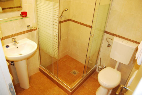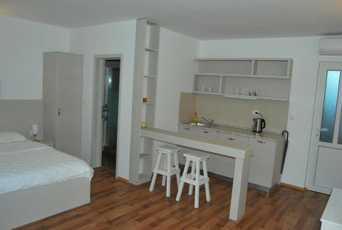 B STUDIO: однокомнатный номер, французская кровать (дополнительная кровать по запросу), два кресла, журнальный столик, чайная кухня (готовить нельзя), холодильник, французский балкон с видом на море, кондиционер, телевизор (6 русских каналов), ванная комната, фен. Максимальное размещение - 3 человека.(28 м2).