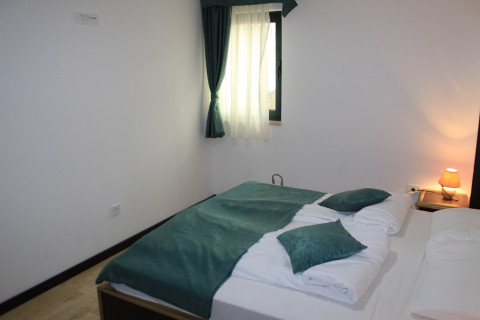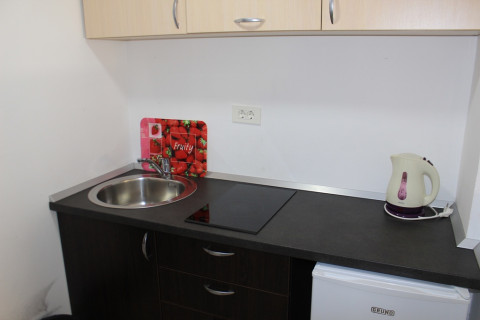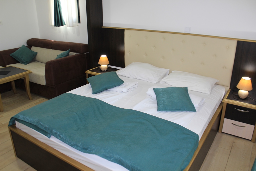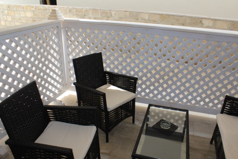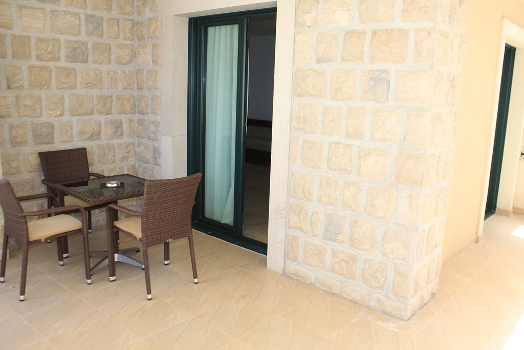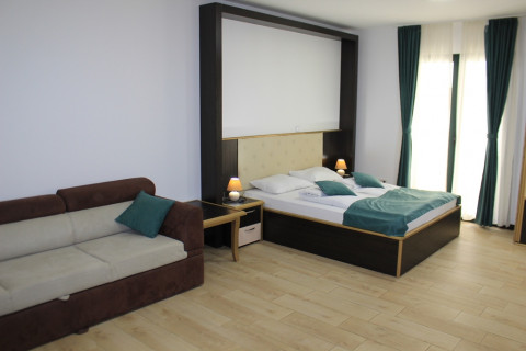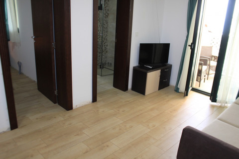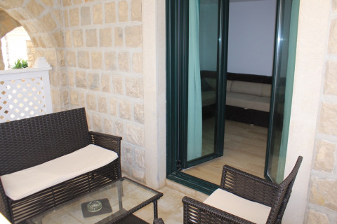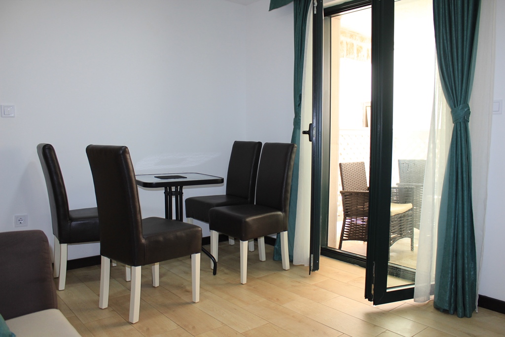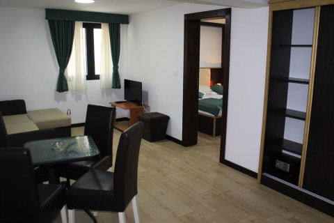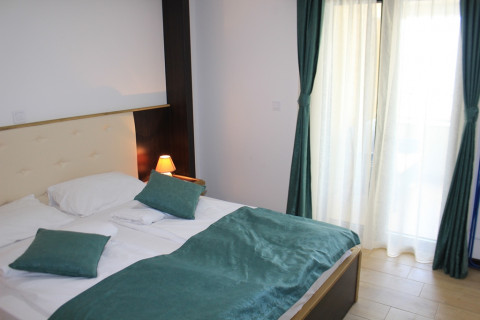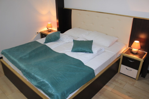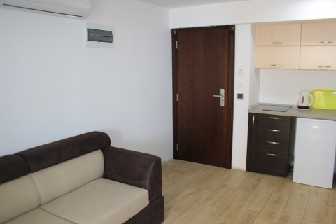 LUX АРР 04: Двухкомнатный номер на первом этаже с отдельным входом, в спальне французская кровать, в гостиной угловой диван , кухня, обеденная зона, ванная комната с душевой кабиной, фен, кондиционер, холодильник, чайник, плазменный телевизор, интернет, cейф, перед входом в номер терраса. Площадь номера 30 м. Максимальное размещение 4 человека.