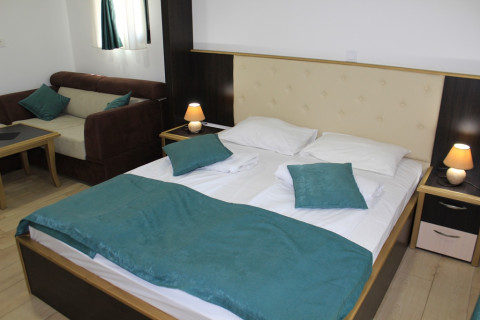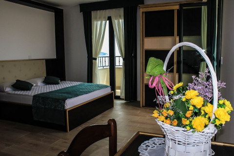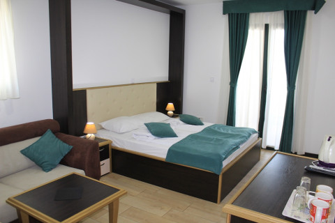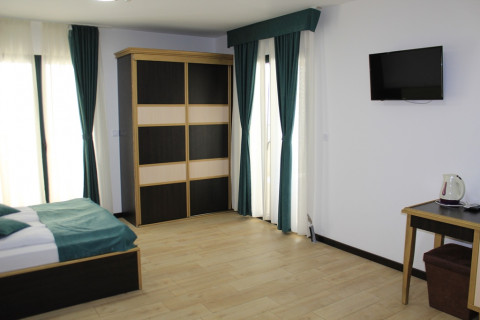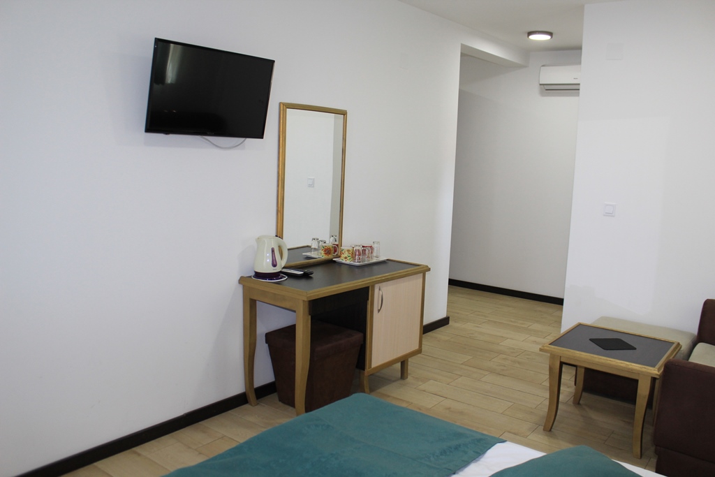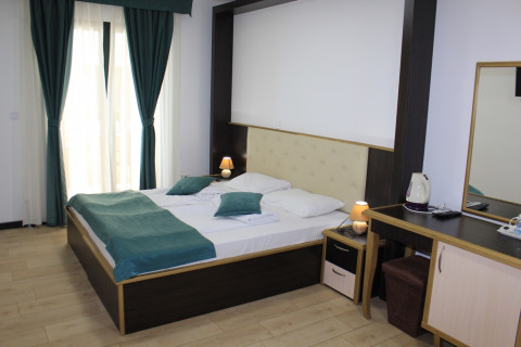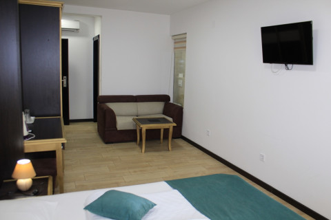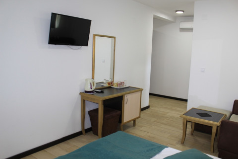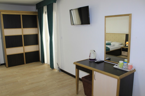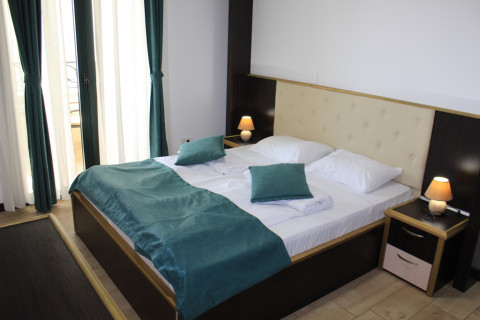 LUX ROOM: в номере французская кровать, возможность дополнительного места, ванная комната с душевой кабиной, фен, кондиционер, холодильник, чайник, плазменный телевизор, интернет, cейф, балкон. Площадь номера 15-25 м. Максимальное размещение 4 человека.
