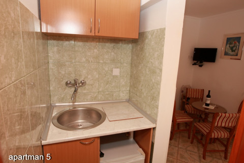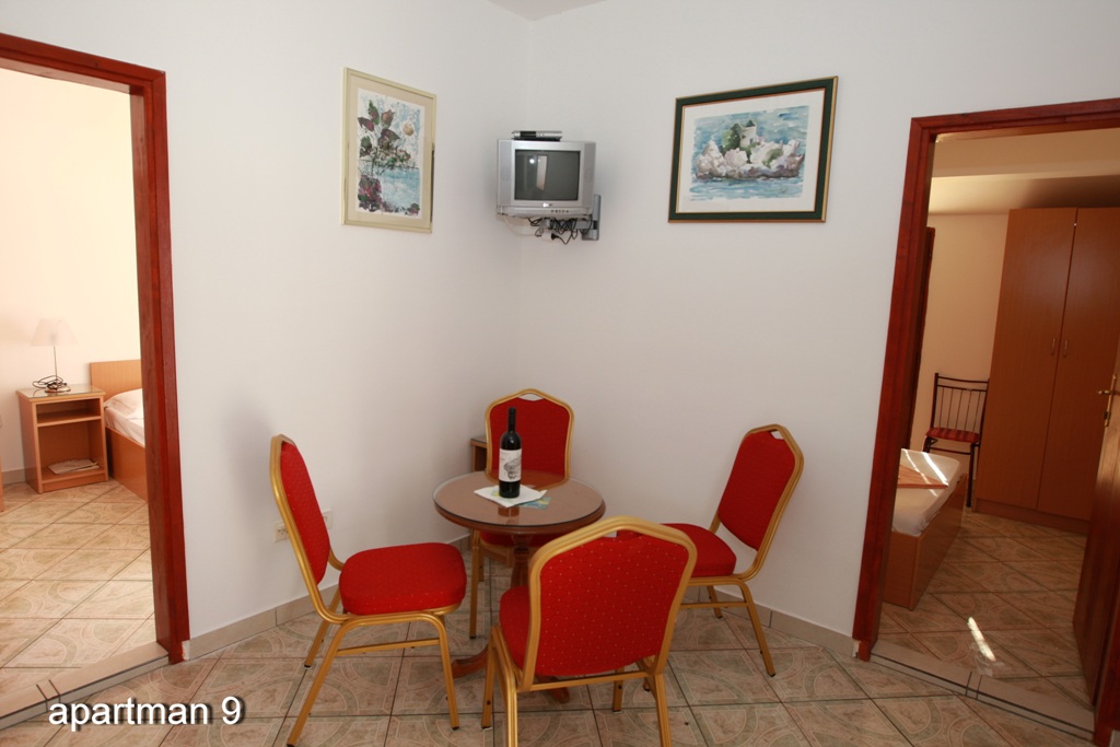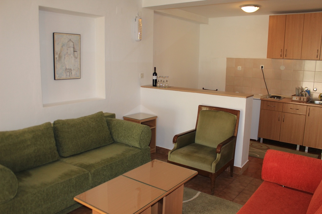 B APP 04+1 PRIZ: номер находится на первом этаже, перед входом в номер терраса, в спальне французская кровать, выход на террасу, в гостиной кухня, холодильник, столовая зона, 2 разкладных дивана, телевизор, кабельное телевидение, кондиционер, фен, утюг, ванная комната, выход на террасу.