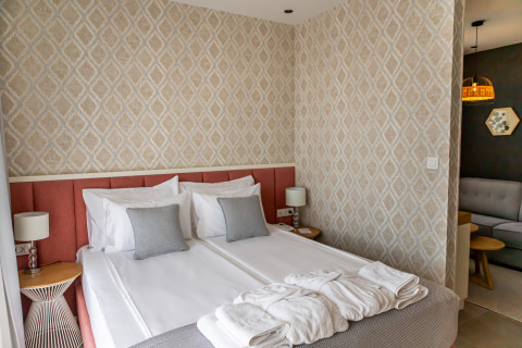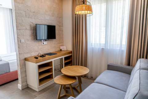 B Family room: зонированный номер, в гостиной раскладывающийся диван, в спальне французская кровать или раздельные кровати, кондиционер, спутниковое ТВ, Wi Fi интернет, сейф, мини бар, чайник, санузел с душевой кабиной, фен, балкон. Максимальное размещение: 2 взр + 2 реб. Площадь: 30 м2.
