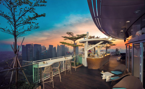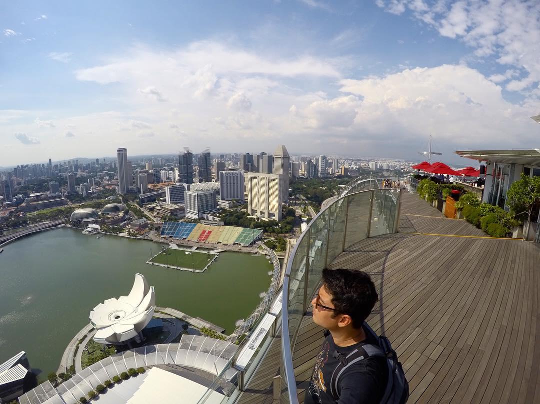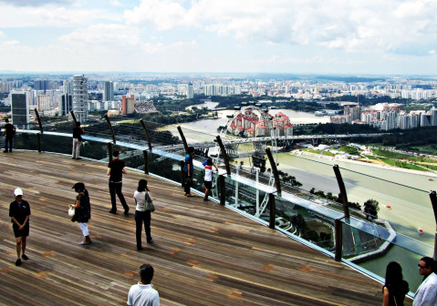 Смотровая площадка Sky Park («Небесный парк») располагается на крыше отеля Marina Bay Sands (MBS). Это один из самых необычайных и дорогостоящих отелей в мире. Он был построен корпорацией Las Vegas Sands в 2010г. Территория отеля в 1,2 га стилизована под тропический оазис, в пышных садах которого произрастают более 250 экзотических деревьев и 650 растений. Три огромные 58-этажные башни этого небоскреба соединены единой «палубой», на которой расположен бассейн, зона отдыха для гостей отеля и смотровая площадка, под которую отведена левая часть «палубы».