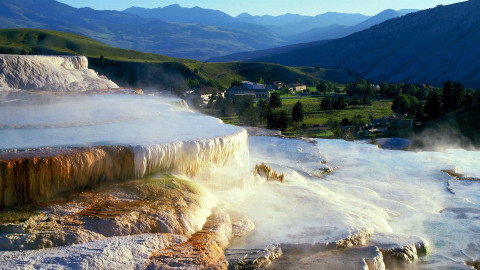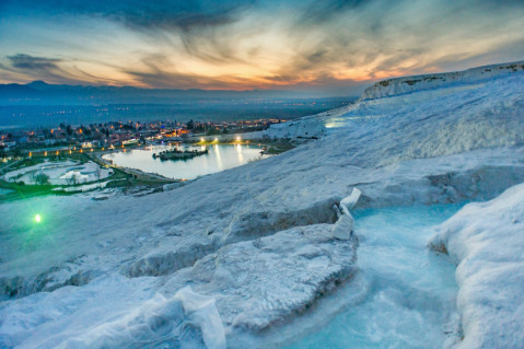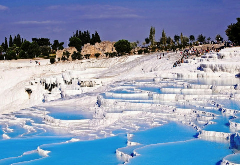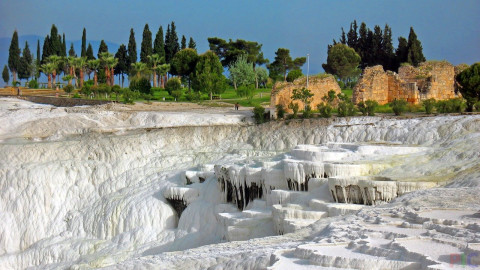 Экзотическим природным ландшафтом Памуккале обязан действию горячих источников, способствующих образованию известковых отложений на травертиновых террасах. Падая с высоты, вода веками создавала окаменевшие белые каскады, переливающиеся в лучах солнца. Это завораживающее зрелище и возможность лечения привлекают сюда миллионы туристов. Памуккале можно смело включить в топ самых красивых мест нашей планеты.