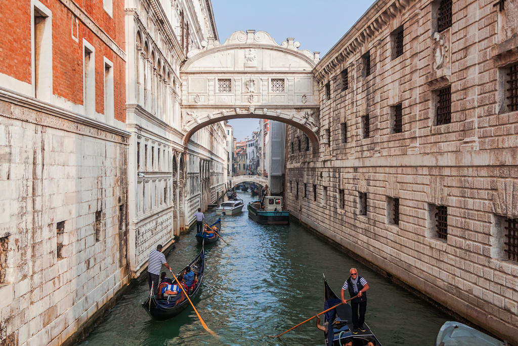 У Венеції 417 мостів, 72 з яких є приватними. Більшість мостів не мають східців, оскільки вони були побудовані, коли для перевезення використовувалися коні. З чотирьох основних мостів через Гранд-канал (Великий канал) найновіший, якому усього лише декілька років, вже починає розпадатися, на відміну від 3 вікових мостів.
