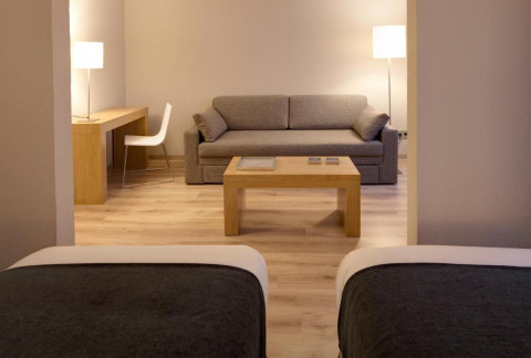 Junior Suite (44 м2, макс. 4+1 /5+0 чел.) 2 односпальные кровати 1,20 х 1,90 + дополнительная кровать 80 х 1,80 в главной комнате и 2 кровати 80 х 1,80 в другой комнате, гардеробная, письменный стол, ванная комната, халат и тапочки, бесплатный сейф;