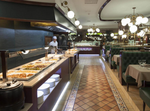 Главный ресторан работает по системе — шведский стол, кухня — интернациональная.