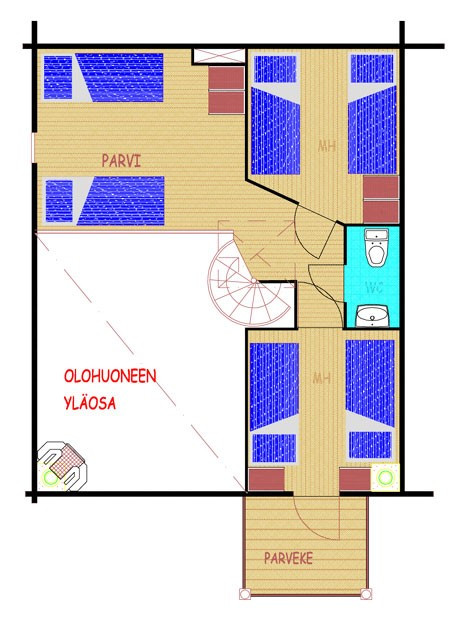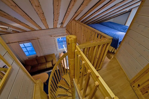 На верхньому поверсі 2 спальні з двома окремими ліжками в кожній (в одній спальні невеликий вентиляційний балкон, інша спальня без вікна), на невеликому лофт (скошена стеля) 2 окремих ліжка, роздільний санвузол.