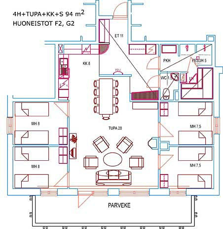 Однорівневі апартаменти 94 m², 4 спальні з двома окремими ліжками в кожній. Вітальня, поєднана з кухнею, камін, електрична сауна, душова, роздільний санвузол.
