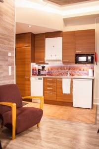 Апартаменти-студія: одне велике ліжко і розкладний диван, міні-кухня, сауна, душова кімната, туалет, балкон.