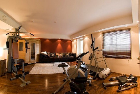 Спортзал і Сауна: сходи з холу веде на нижній поверх, де розташований спортзал і інфрачервона сауна. У приміщенні сауни великий диван, ТВ, камін, а також стіл на 8 осіб. Після сауни можна зануритися в джакузі, розташованої на терасі під відкритим небом або зануритися в ополонці замерзлої річки. На березі річки так само для користування гостей традиційна Фінська сауна на дровах.