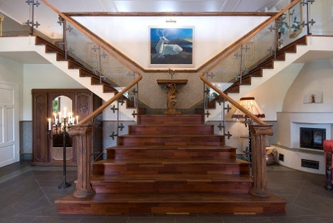 Другий поверх: по великій сходах Ви потрапляєте на 2ий поверх. На 2Ом поверсі розташована власна бібліотека, де Ви можете усамітнитися і провести час самі з собою. Поруч з бібліотекою розташована королівська їдальня для 8ми чоловік. У їдальні є свій камін і великий диван.