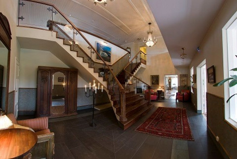 Через двері вітальні Ви потрапляєте в Дзеркальний кімнату з видом на замерзлу річку. Тут можна провести нараду або вечерю великою дружною компанією. Стіл призначений для 26 осіб. Унікальність кімнати додає гарний порцеляновий камін.