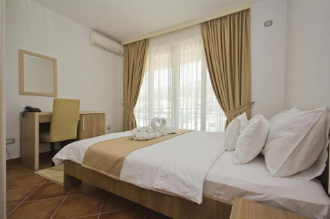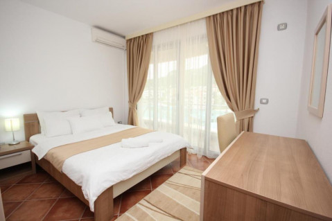 Прямо на березі пляжу Великий Песак в селищі Добра Вода. Відстань до аеропорту Тіват 70 км, Підгірці 72 км.