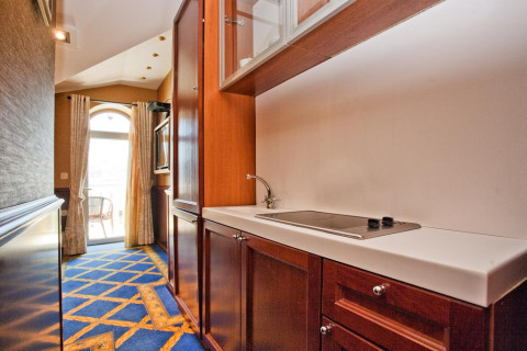 В JUNIOR SUITE №4: вітальня c диваном, спальня з французьким ліжком, кондиціонер, супутникове ТБ, Wi Fi інтернет, сейф, санвузол з душовою кабіною, вид на море. Площа номера 25 м2. Максимальне розміщення: 3 людини.