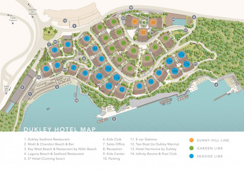 Dukley Resorts розділений на три частини: Seaside, Gardens і Sunny Hill. Seaside розташований найближче до моря, морський пейзаж є логічним продовженням апартаментів в віллах, розташованих на цій лінії.