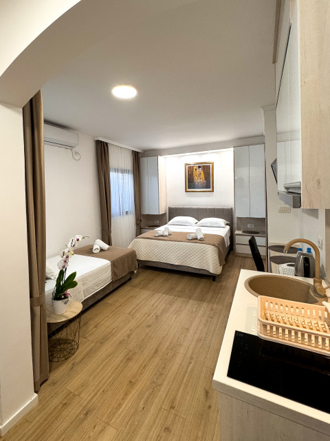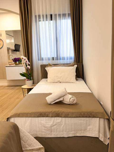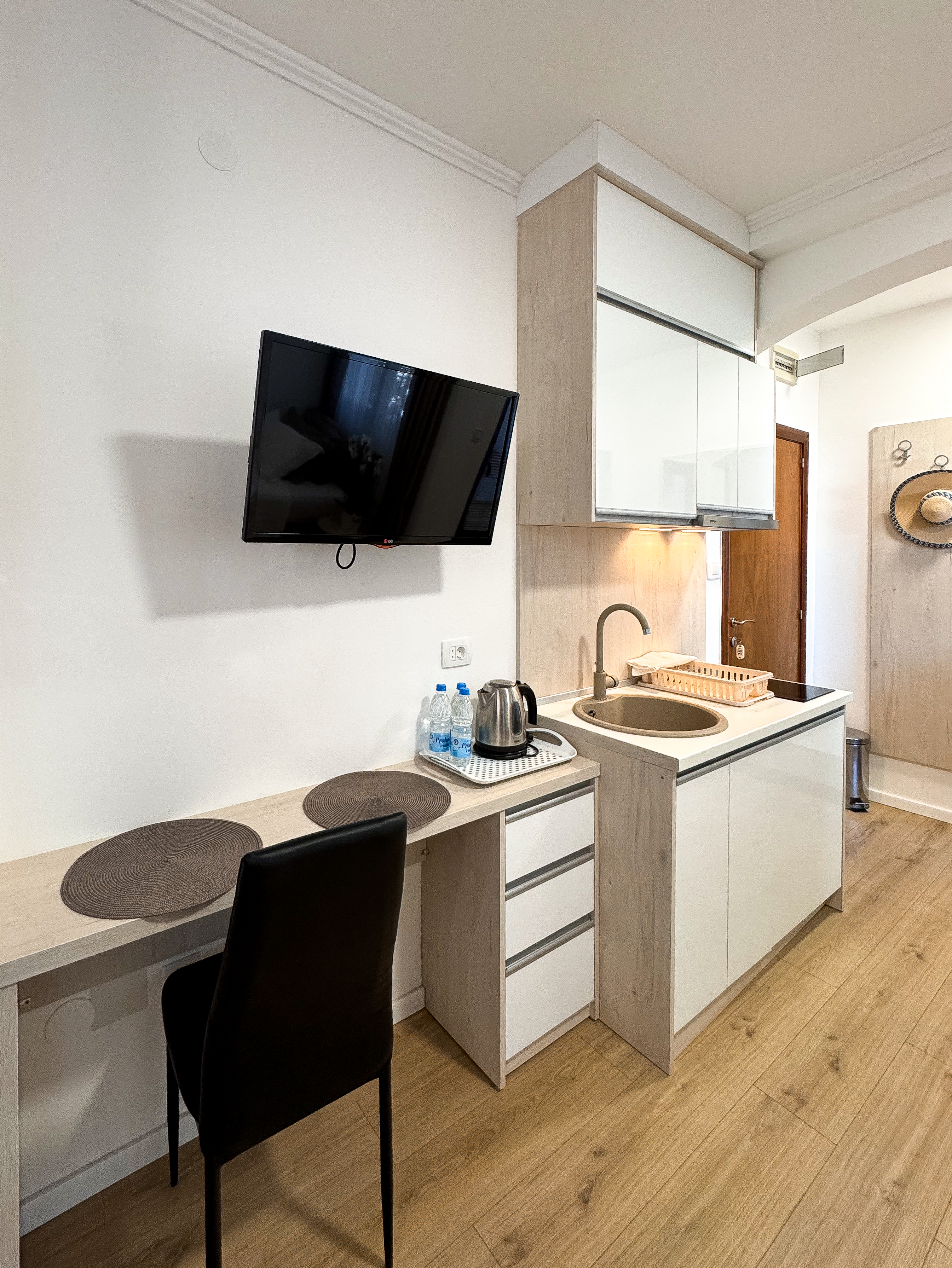 STUDIO for 3 pax: студіо номер для 3 осіб, площа до 25 м2, кондиціонер, міні-кухня, міні-холодильник, санвузол, балкон, двоспальне ліжко та односпальне ліжко.