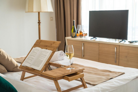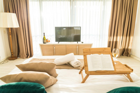 В Deluxe APP SV: вітальня з диваном, що розкладається, чайна кухня, спальня з великим французьким ліжком, кондиціонер, супутникове ТБ, LCD-телевізор, Wi Fi інтернет, міні-бар, сейф, санвузол з душовою кабіною, фен, балкон з видом на море. Площа: 50 м2. Максимальне розміщення 4 чол.