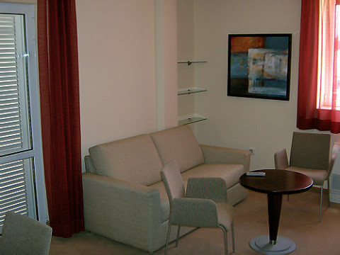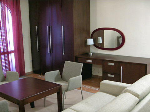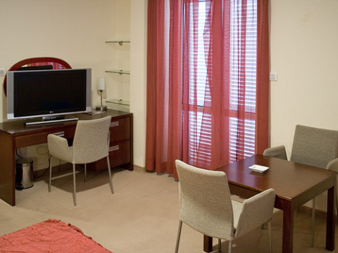 В APP: Велике приміщення, з виділенням вітальні та спальні зонами, двоспальне ліжко і вітальня зона з розкладним диваном, кондиціонер, холодильник, кухонний блок, кабельне телебачення, телефон, балкон, фен, душова кімната. Максимальне розміщення - 2 + 1 людина. Два номери мають кухню.