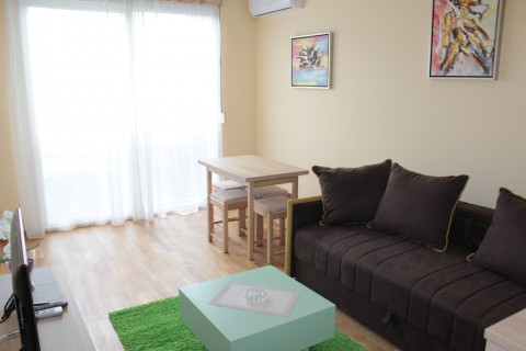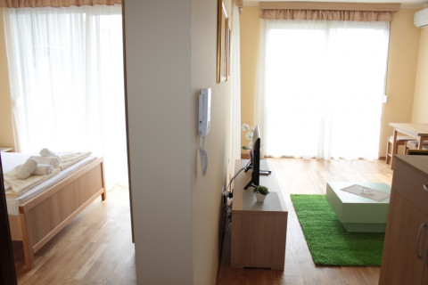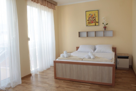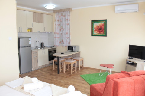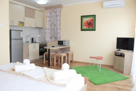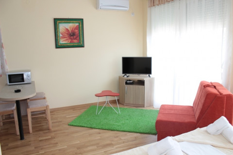 В STUD 02+1: просторий номер з панорамними вікнами з видом на гори, французьке ліжко, розкладне крісло, повністю укомплектована кухня, холодильник, ванна комнт, пральна машинка, фен, праска, кондиціонер, кабельне телебачення, інтернет Wi-Fi, французький балкон .