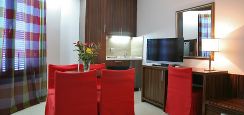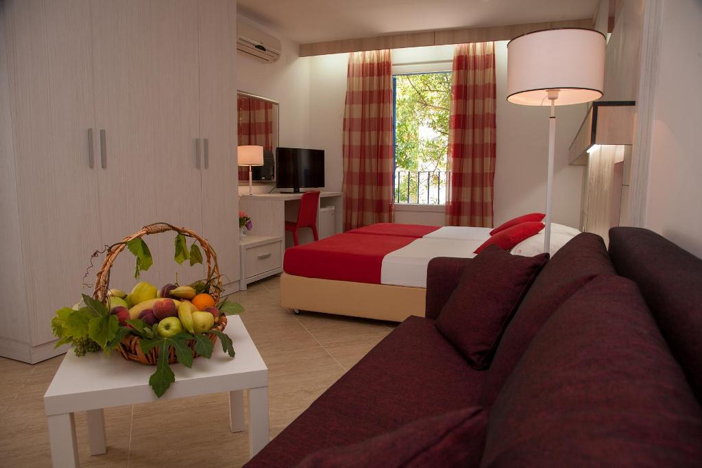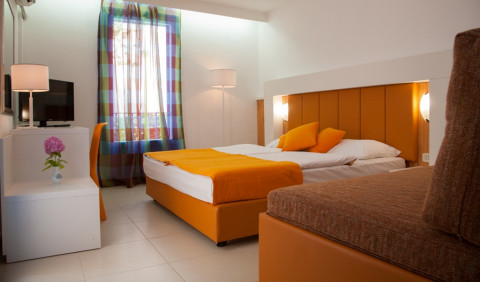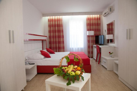 В APP 02/ 3*: Відповідає категорії 3*+, однокімнатний номер, кондиціонер, кабельне телебачення, холодильник, міні-кухня (90% номерів), фен для волосся, сейф, ванна або душова, балкон/тераса (або їх відсутність), доплата за балкон-2 євро за людину. Мінімальне розміщення – 2 дорослих, максимальне – 3 дорослих.