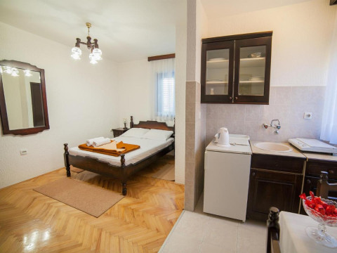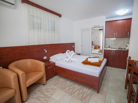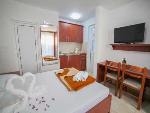 однокомнатный номер, двуспальная кровать, кухня, ванная, холодильник, чайник, кондиционер, ванная, терраса, WiFi, кабельное ТВ.