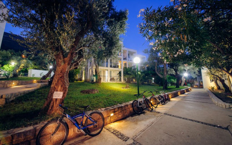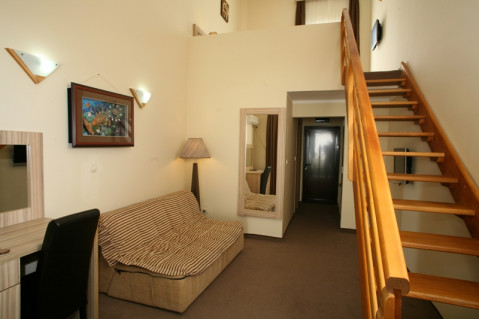 В APP: Площею 45 м2, дворівневі, на першому поверсі, вітальня з диваном, на другому - французьке ліжко; кухні - немає. Всі апартаменти з кондиціонером, телефоном, SAT-TV, ванною кімнатою, феном, міні-баром, сейфом, великою терасою (10 м2). Номери знаходяться в вилах.