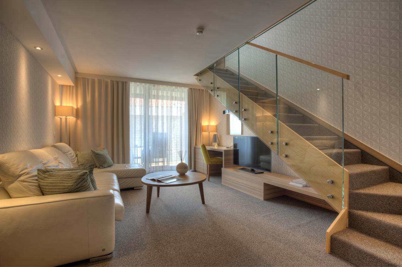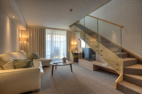 В SUITE DUPLEX: дворівневий номер, на нижньому рівні вітальня, на верхньому спальня з великим французьким ліжком, окремий санвузол, кондиціонер, супутникове ТБ, пряма телефонна лінія, Wi Fi інтернет, cанузел з душовою кабіною і джакузі, фен, халати, тапочки, міні-бар, кава машина, сейф, балкон з видом на парк. Площа: 80 м2. Максимальне розміщення: 2 людини.
