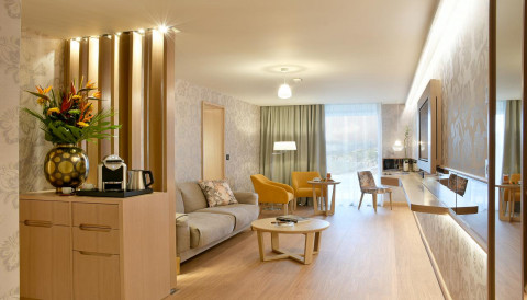В SUITE SV: двокімнатний номер, вітальня, в спальні велике французьке ліжко, кондиціонер, супутникове ТБ, пряма телефонна лінія, Wi Fi інтернет, міні бар, кава машина, сейф, cанузел з душовою кабіною, фен, халати, тапочки, балкон з видом на море. Площа: 47 м2. Максимальне розміщення: 2 дорослих.