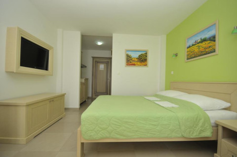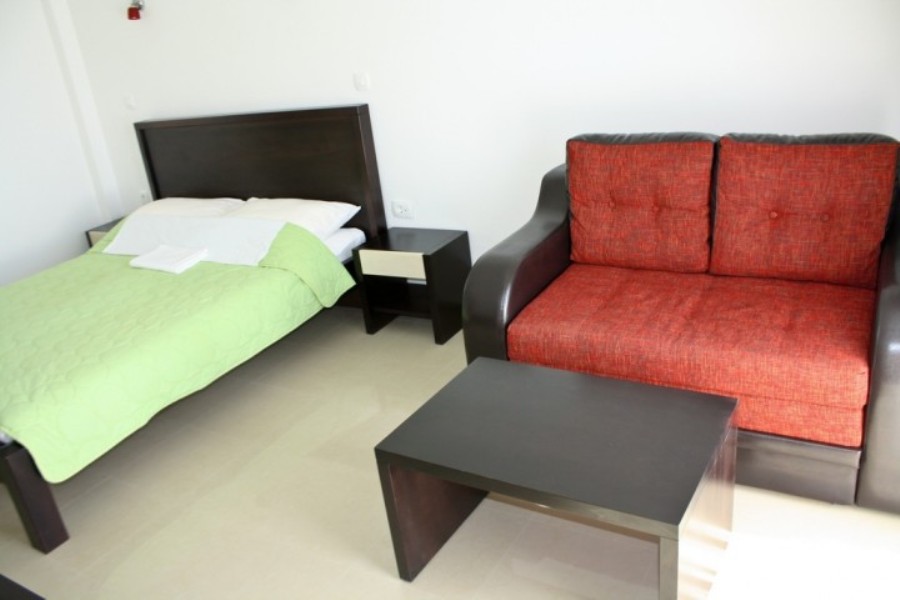 Studio 03 superior sv (№16,17,21,22,23): 24 м2, терраса 4-6 м2 с прямым видом на море, французская кровать (160x200cm) + раскладной диван (120×200cm), мини-кухня (комплект посуды, электрический чайник, варочная панель), ванная комната с душем. Максимальное размещение — 3 человека.