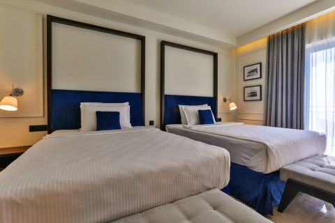 В Deluxe DBL SV: французьке ліжко та софа, кондиціонер, супутникове ТБ, Wi Fi інтернет, сейф, міні бар, електричний чайник, санвузол з душовою кабіною, балкон з видом на море. Максимальне розміщення: 2 чол. Площа: 43 м2.