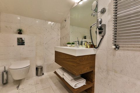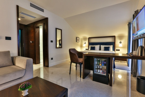 В Junior Suite MV: французьке ліжко та софа, зона відпочинку, кондиціонер, супутникове ТБ, Wi Fi інтернет, сейф, міні бар, електричний чайник, санвузол з душовою кабіною, тераса з видом на гори. Максимальне розміщення: 2+2 чол. Площа: 36 м2.