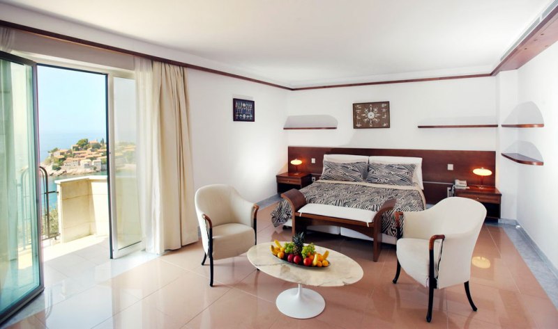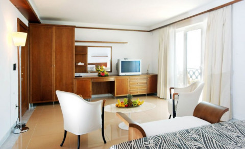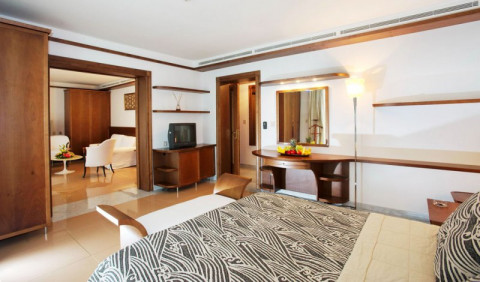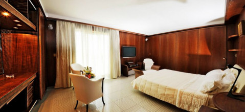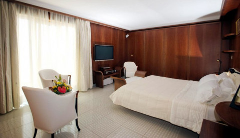 JUNIOR SUITE № 104: Розміщення 2+1 pax. Передпокій, вітальня та спальня. У салоні двомісний диван з кріслами, журнальний столик, міні-бар, телевізор, телефон, кондиціонер, сейф. Вихід на загальні тераси. У спальні двоспальне ліжко, телефон, телевізор, міні - бар. Вихід на загальну терасу. Дві ванні кімнати. У ваннах - душова кабіна. (57 м2).
