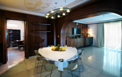 PRESIDENTIAL SUITE № 109: Розміщення 4 pax. В апартаменті передпокій з гардеробом, кухня, вітальня, спальня, дитяча, сауна. У салоні 2 журнальних столика, 2 крісла, 2 двомісні дивани, телнфон, плазма екран і сураунд системою, музичний центр. У спальні ліжко 2000 х 1700, телнфон, телевізор. З салону і спальні вихід на власний балкон з лежаками. У дитячій ліжко 2000 х 900, телевізор. Ванна кімната з джакузі і душовою кабіною, телефон, телевізорльний столик, міні-бар, телевізор, кондиціон. (113 м2).