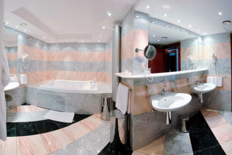 ROYAL SUITE №105: Розміщення 4 pax. Передпокій, кухня, велика вітальня, дві спальні. Вхід а апартамент з коридору або ліфта, за допомогою кодової електронної карти. Повністю обладнана кухня. На стіні плазма екран і сураунд система CDі видио. Вихід на власну терасу, яка розташована уздовж всього апартаменти. У великій спальні двоспальне ліжко 2000 x1700, плазма екран і сураунд система з відео і CD, сейф, телефон і вихід на терасу. У меншій спальні ліжко 2000 х 1700, телевізор з DVD, телефон і велике вікно, без виходу на терасу. В апартаментах 2 ванні кімнати і туалет. Велика ванна кімната з джакузі. (156 м2).