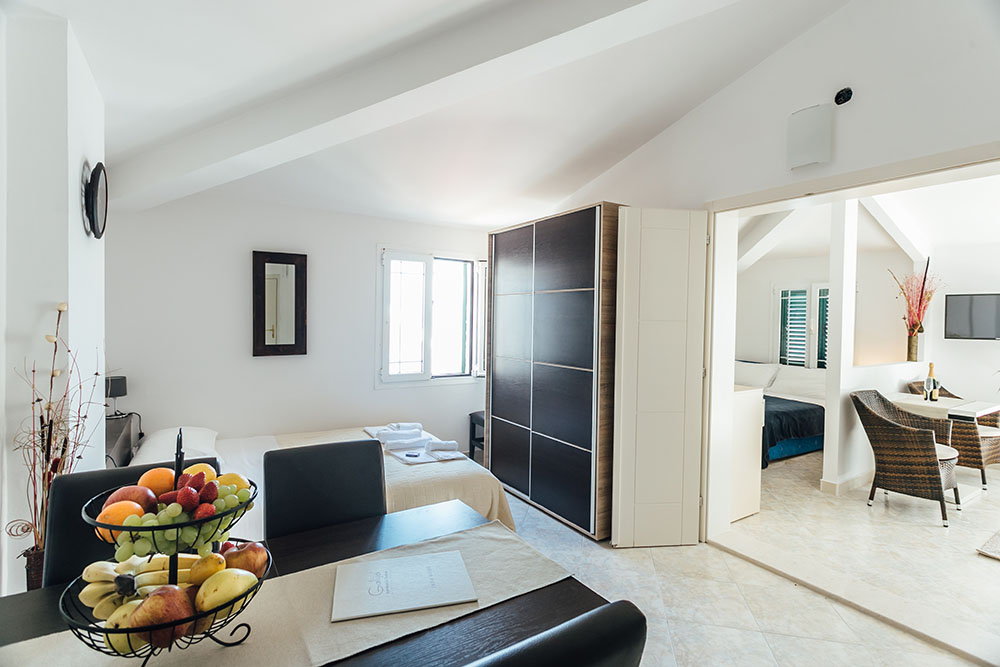 В APP 06 SV: в першій кімнаті зонувати вітальня з диваном і спальна зона з французьким ліжком, в іншій кімнаті їдальня з кухнею і зонувати спальня з французьким ліжком. Кондиціонер, кабельне ТБ, Wi Fi інтернет, санвузол з душовою кабіною, тераса з видом на море. Площа: 55м2. Максимальне розміщення: 6 чол.