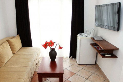 В JUNIOR SUITE: Двокімнатний номер, дверей між кімнатами немає, спальна зона з двоспальним ліжком, у залі - диван, стіл, шафа, інтернет, супутникове ТБ, кондиціонер, чайник, балкон, холодильник, в ванной - душова кабіна, фен, туалет. Максимальне розміщення 4 людини. (26м2).