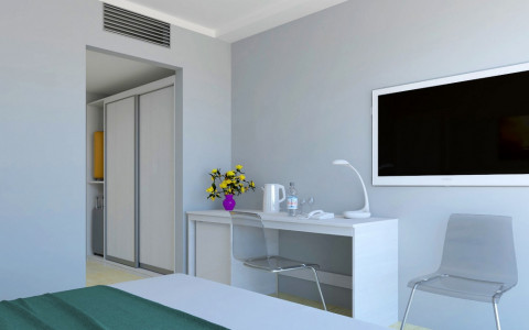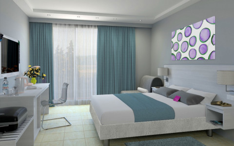 В SUITE PREMIUM SV: 38 кв.м. У номері двоспальне ліжко та два односпальні ліжка або двоспальний диван в додаткової спальні, розділеної перегородкою, 2 телевізори, всі номери з видом на море і балконом для тих моментів сходу і заходу.