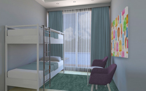 В 2BR SUITE: 34кв.м. Номер з 2 спальнями з ліжком розміру "queen-size" та двох'ярусним ліжком в окремій спальні. У всіх номерах є балкон і вид на сад.