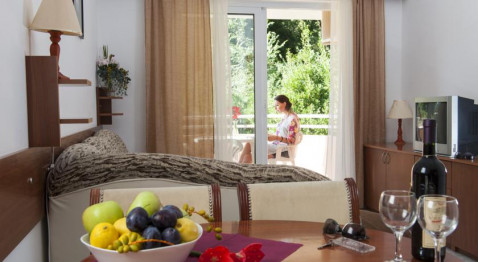 В APP: двокімнатні номери знаходяться в головному корпусі, спальня з французьким ліжком та вітальня з диваном і кухнею, холодильник, обідній стіл, кондиціонер, кабельне телебачення, балкон, душ. Максимальне розміщення - 4 чоловік.