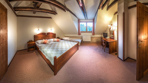 Номер COMFORT. Двухместные номера с 1 дополнительным местом. В номерах: ванная комната, туалет, фен, телефон, мини-бар, сейф, Wi-Fi, халаты. Номера оборудованы стильной деревянной мебелью.