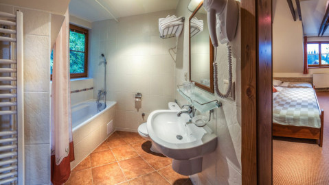Номер ECONOMY PLUS. В номерах: ванная комната, туалет, фен, телефон, мини-бар, сейф, Wi-Fi, халаты. Некоторые номера с балконом или видом на лыжную трассу Белый Путь.